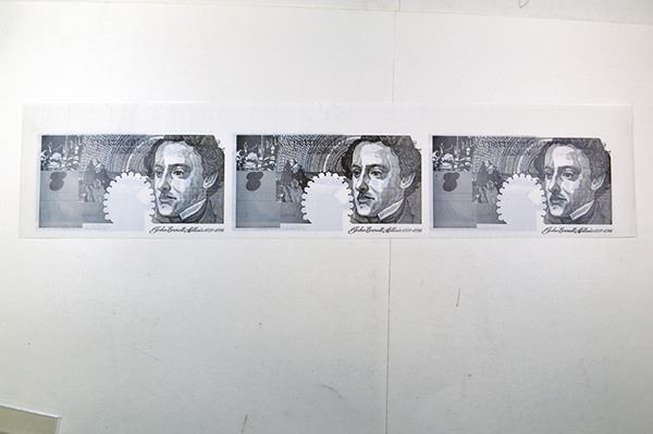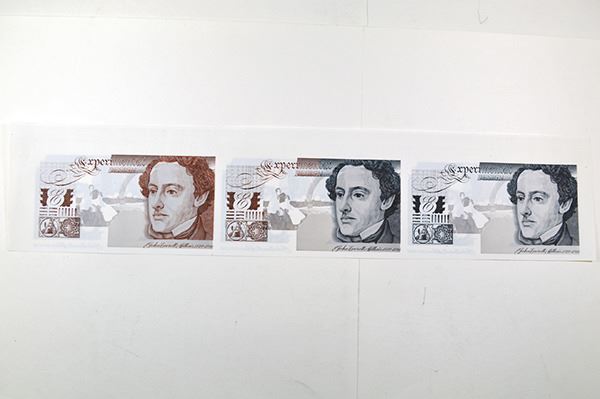 Uncut horizontal sheet of 3 different colored notes. John Everett Millais Portrait on right, the left note is light brown, the middle note is light brown and black and the right note is all black, the backs are all gray and the same for all 3 notes. Uncirculated to Gem Unc. Rare sample notes on polymer DuraNote paper.