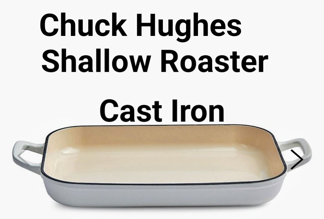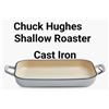 Durable cast iron construction, shallow design ideal for roasting and baking, new.