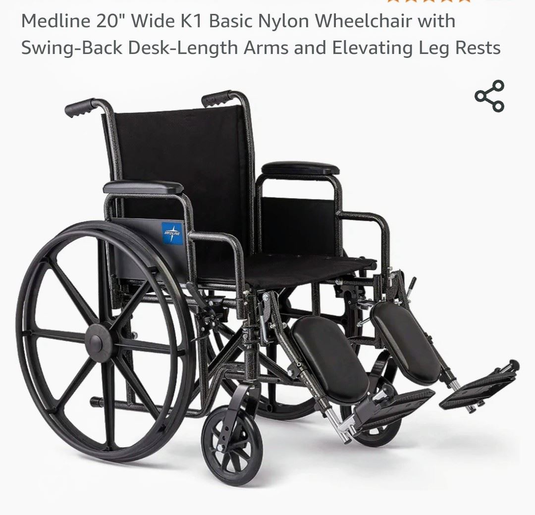 Durable nylon upholstery, 20-inch seat width with swing-back arms and elevating leg rests, new.