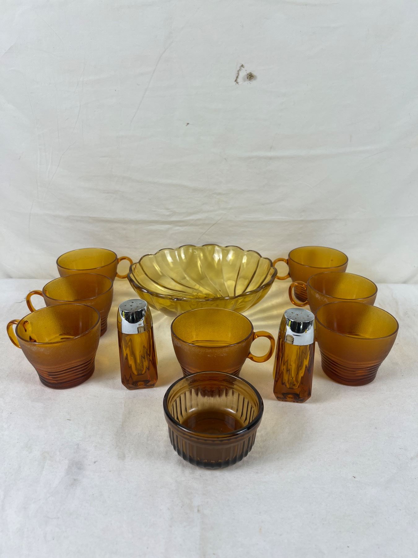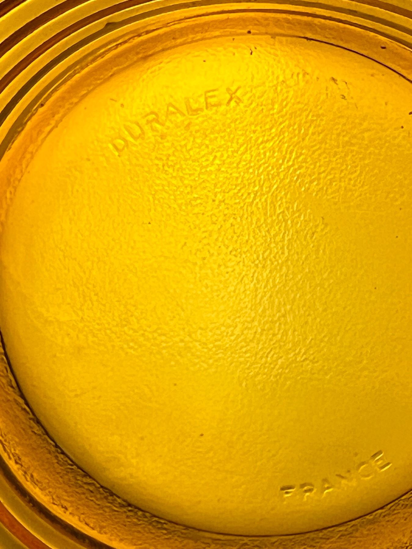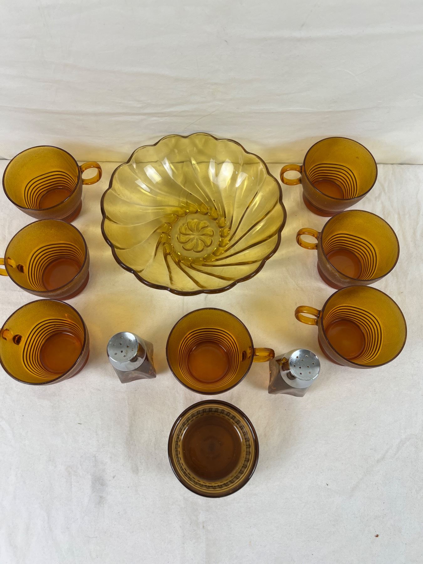 Cups only are Duralex pieces and number 7 in total, some have white marks around rim. Small dish is Anchor Hocking. Large bowl measures 9" in diameter