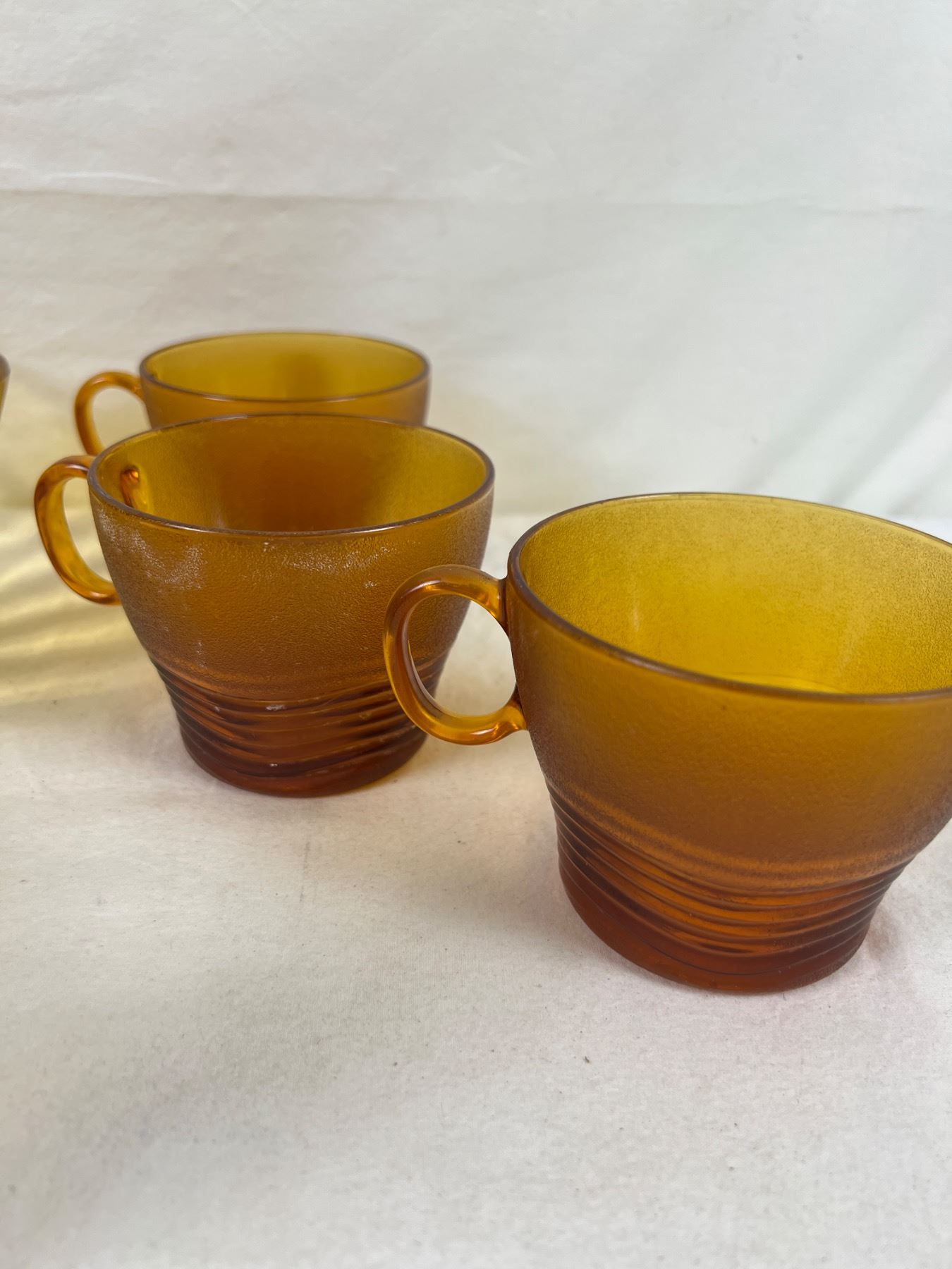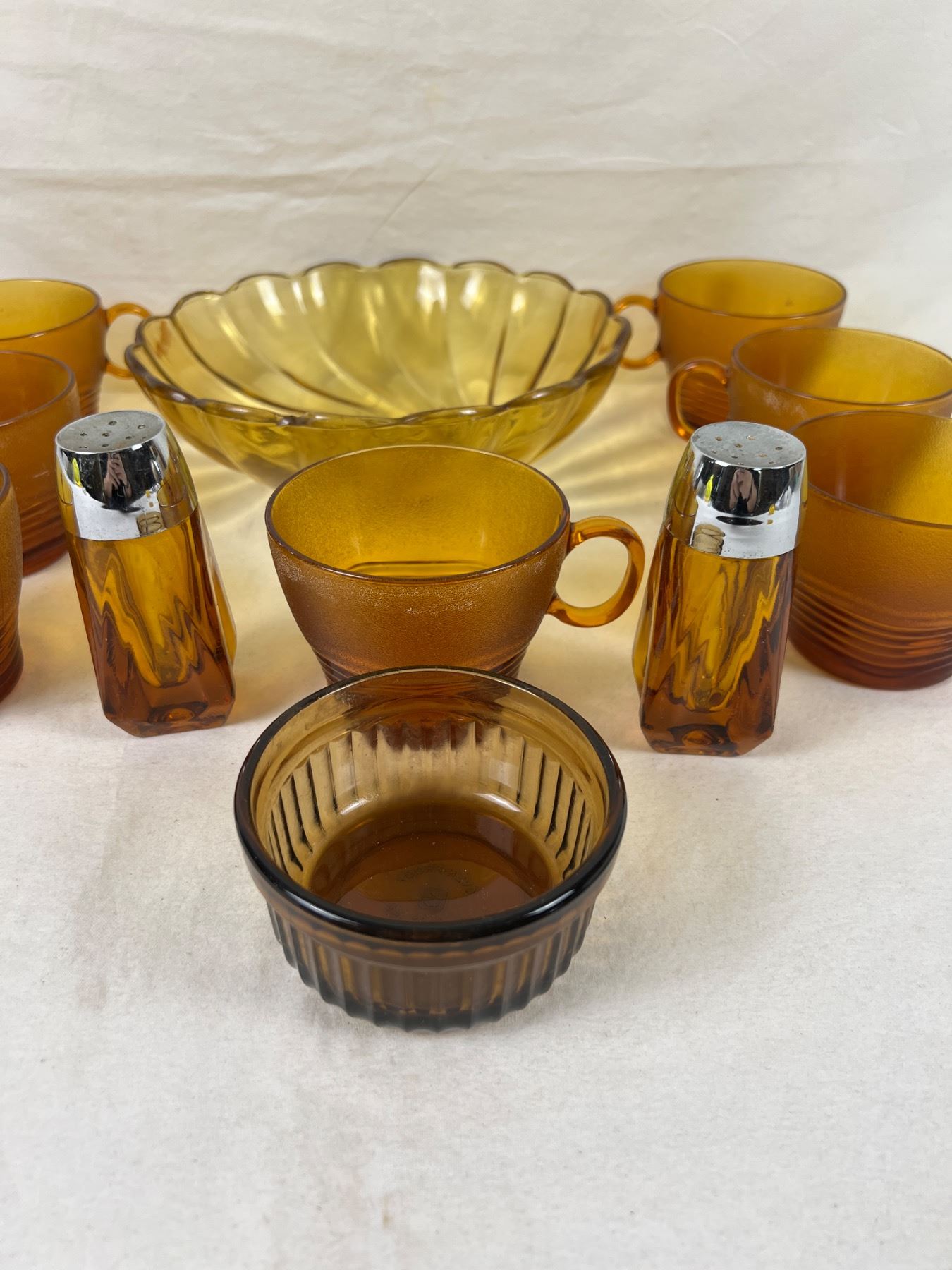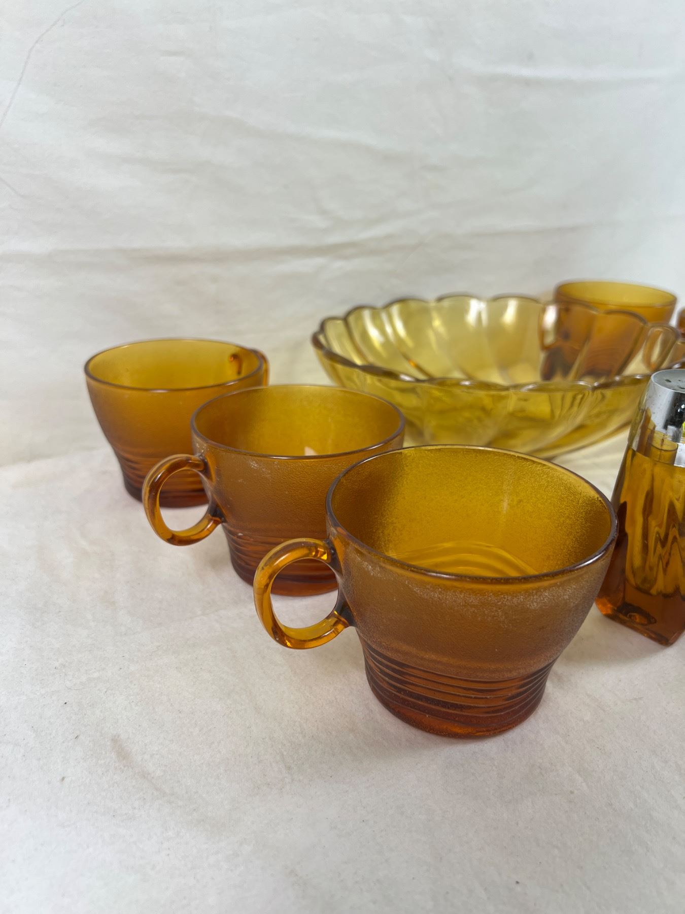 Cups only are Duralex pieces and number 7 in total, some have white marks around rim. Small dish is Anchor Hocking. Large bowl measures 9" in diameter