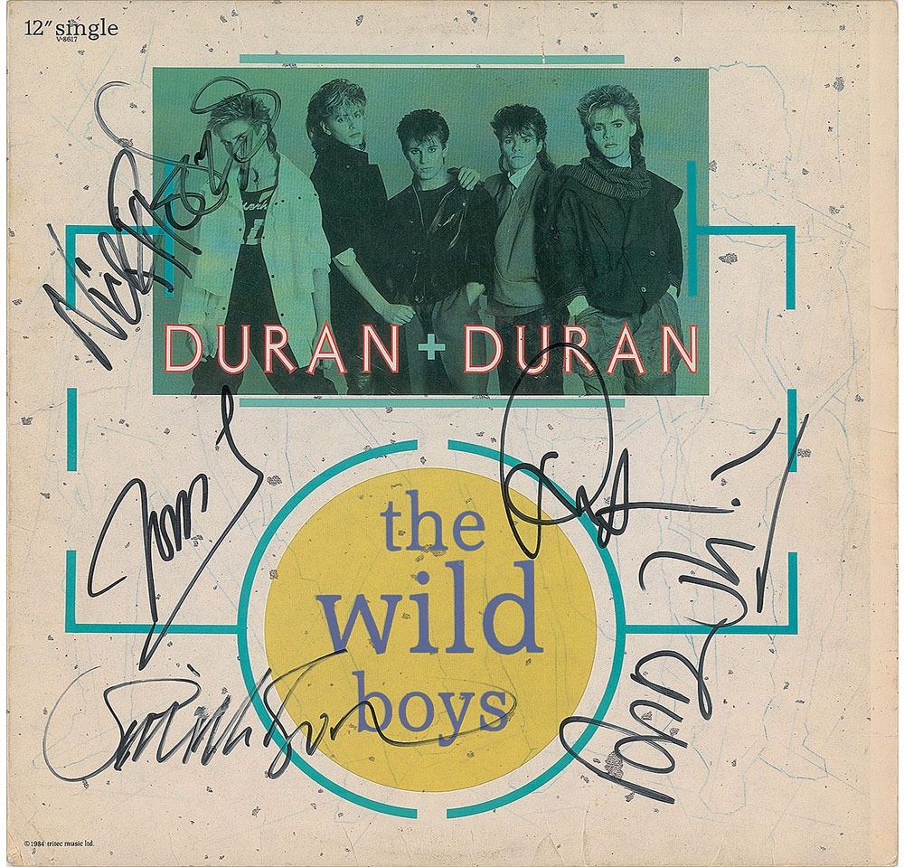 'The Wild Boys' single album signed on the front cover in black felt tip by Nick Rhodes, Simon Le Bon, John Taylor, Roger Taylor, and Andy Taylor. In fine condition, with scattered creasing and a scratch to top edge. The record is not included. Originally obtained by in-person specialist Mike Wehrmann.