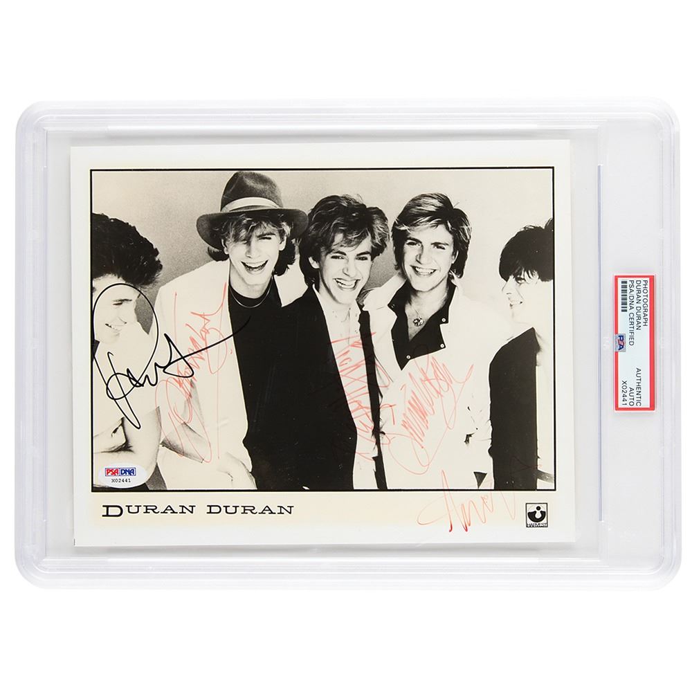 Glossy 10 x 8 Harvest Records publicity photo of Duran Duran, signed in red felt tip by John Taylor, Nick Rhodes, Simon Le Bon, and Andy Taylor, and in black felt tip by Roger Taylor; Andy and Roger have signed first names only. In fine condition, with a uniform block of light toning from previous display and a PSA/DNA label affixed to the lower corner. Encapsulated in a PSA/DNA authentication holder.