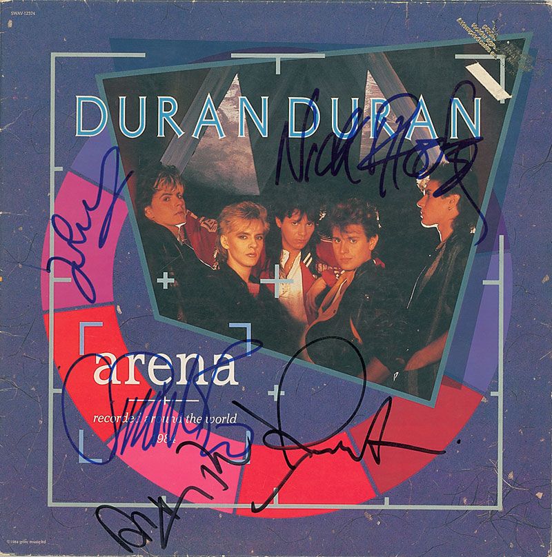 Promotional copy of Arena album signed on the front cover in blue and black felt tip by Simon Le Bon, John Taylor, Andy Taylor, Nick Rhodes, and Roger Taylor. Scattered edge creases, ‘ring of wear’ to covers, promotional stamp to top right, and some scattered light surface marks, otherwise fine condition. The record is not included.