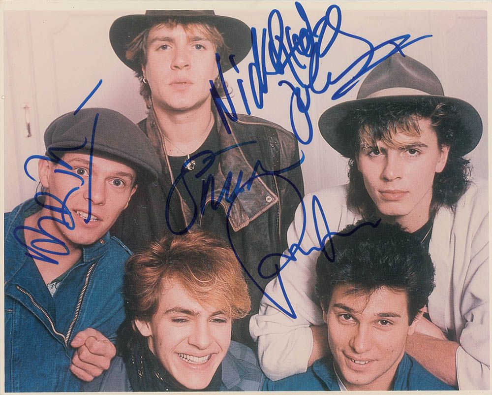 Color glossy 10 x 8 group photo, signed in-person in blue felt tip by Simon Le Bon, John Taylor, Andy Taylor, Nick Rhodes, and Roger Taylor. In fine condition, with a tack hole to the left border. Originally obtained by in-person specialist Mike Wehrmann.