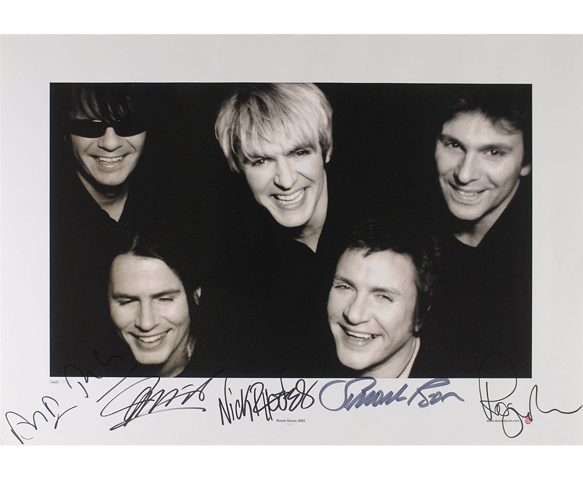 Limited edition glossy 23.25 x 16.5 print of the band in 2002, numbered 444/500, signed in black felt tip by Simon Le Bon, John Taylor, Andy Taylor, Nick Rhodes, and Roger Taylor. In fine condition.