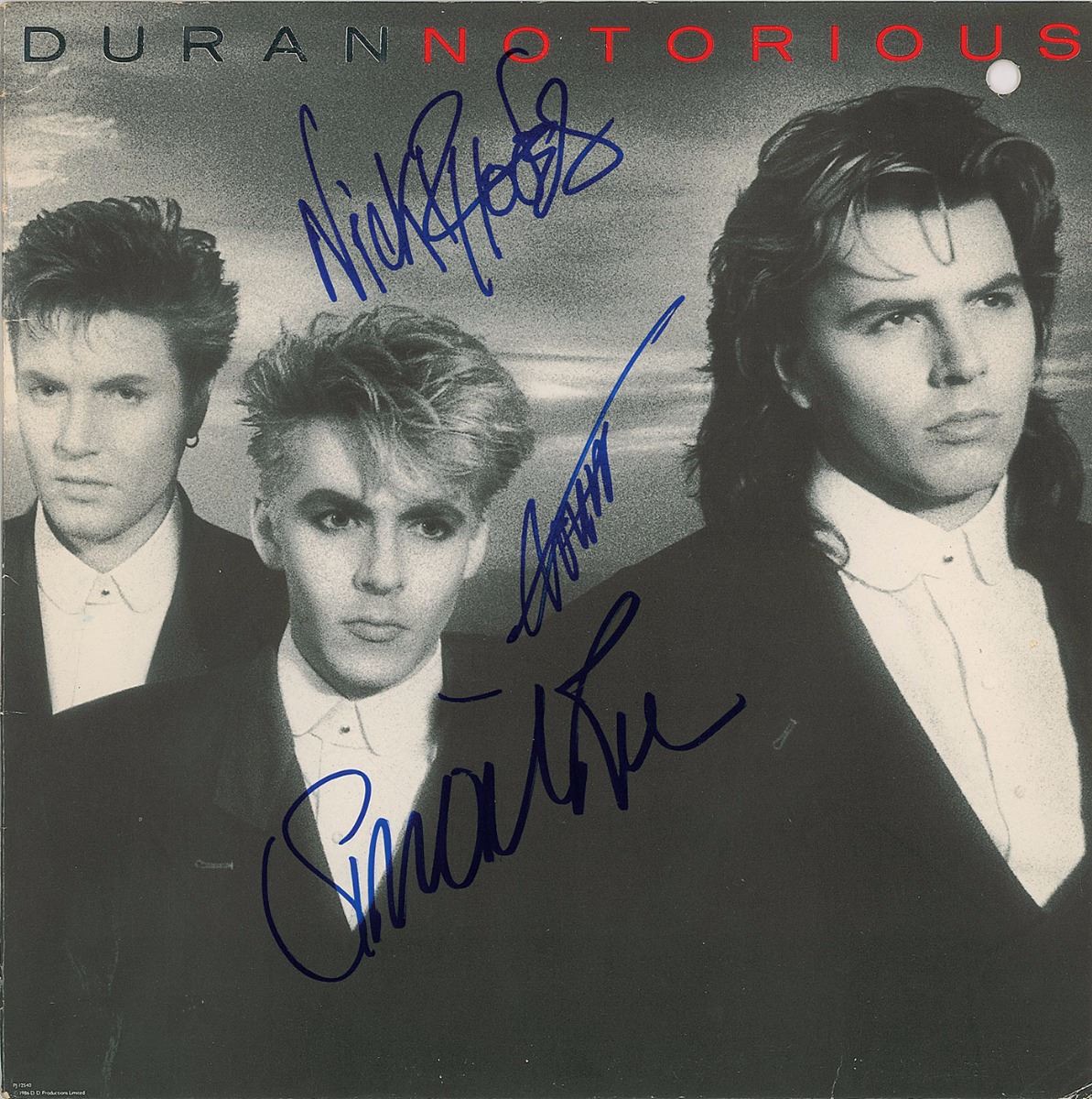 Notorious album signed on the front cover in blue felt tip by Simon Le Bon, John Taylor, and Nick Rhodes. In fine condition, with a discount hole to upper right, trivial soiling, and creasing to left edge and corners. The record is not included. Originally obtained by in-person specialist Mike Wehrmann.