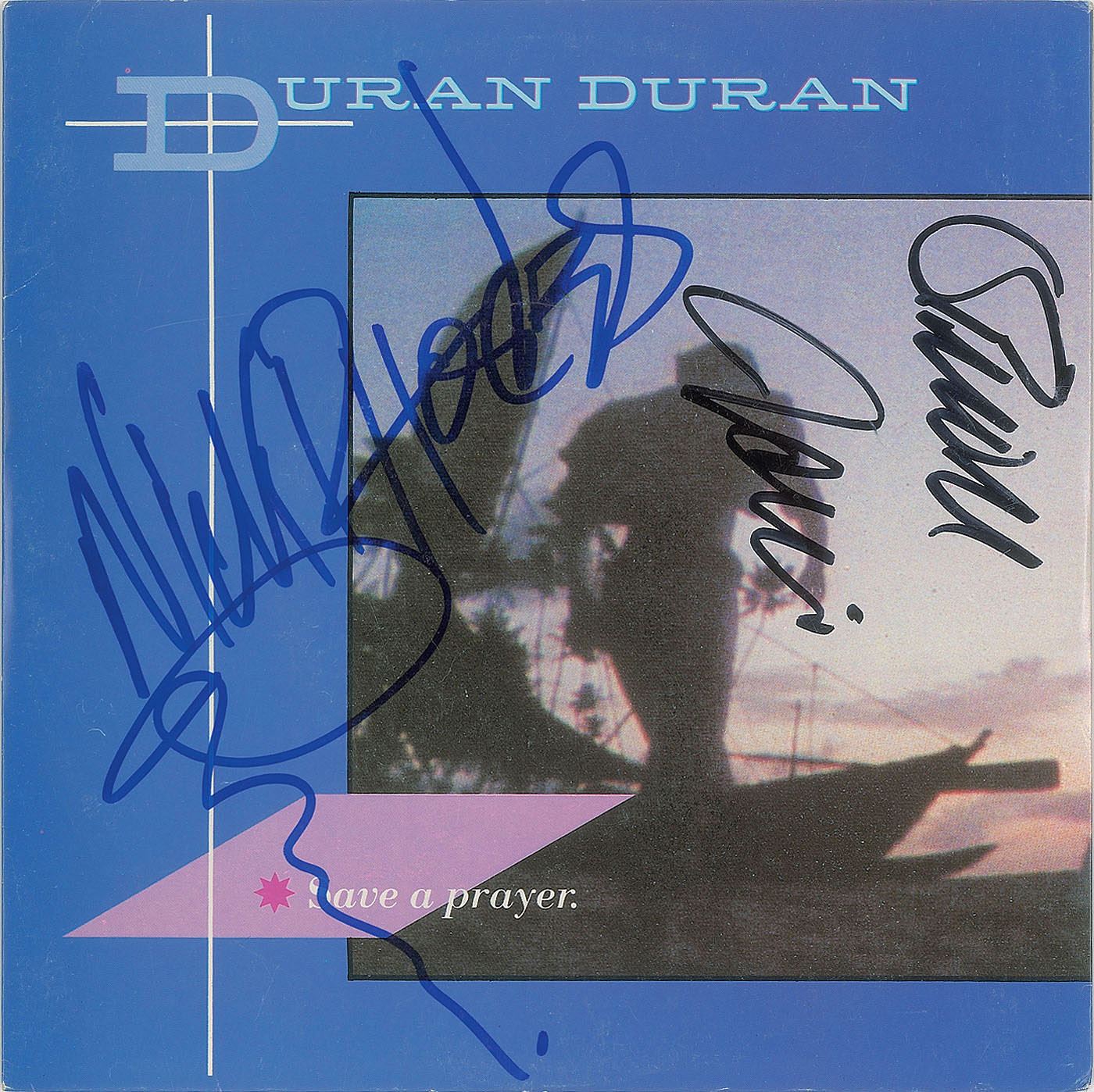 45 RPM single promo record for 'Save a Prayer / Hold Back the Rain,' signed on the front of the sleeve in blue felt tip by Nick Rhodes and Roger Taylor, and in black felt tip by Simon Le Bon and Andy Taylor. In fine condition. The record is included.