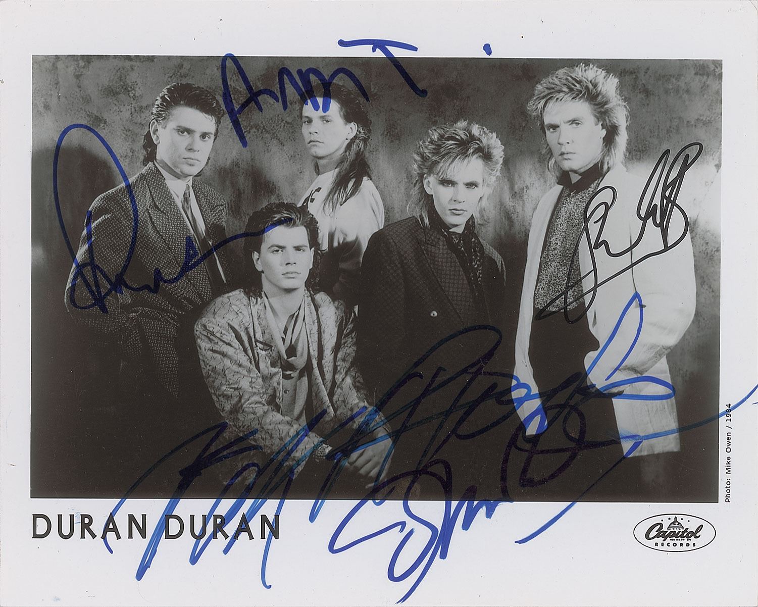 Glossy 10 x 8 Capitol Records publicity photo of Duran Duran from 1984, signed in felt tip by Simon Le Bon, Nick Rhodes, Roger Taylor, John Taylor, and Andy Taylor. In fine condition.