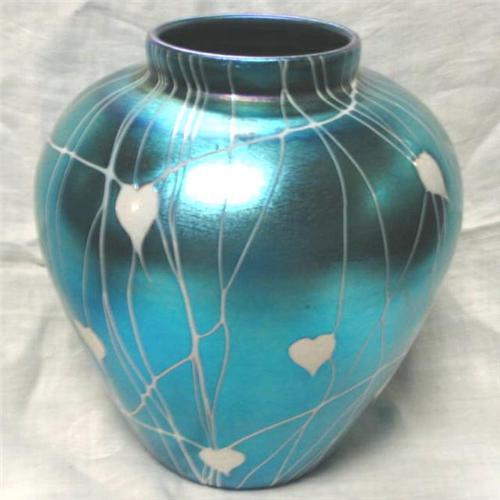 Durand art glass vase, shouldeered vessel in brilliand blue lustre with opal heart and vine decoration, unsigned, a very nice example, 7 1/2" in diameter and 8" tall, excelent condition, 1924-1931.