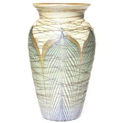 Durand vase, shouldered form with flaring rim in opaque pale yellow glass with pulled feather design, applied gold threading, signed, #1812, 7.75”h
