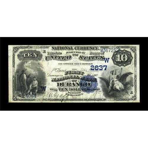 <B>Durango, CO</B></I> - $10 1882 Date Back Fr. 545 <B>The First NB</B></I> Ch. # (W)2637<BR> An attractive and very scarce early example from this much collected community. There is a bit of unimportant soil on the reverse, but the face is bright and utterly unmolested. <B>Fine-Very Fine,</B></I> with bold pen signatures. <BR><BR><b>Shipping:</b> Coins & Currency (<a target="_blank" href="http://www.heritageauctions.com/common/shipping.php">view shipping information</a>)