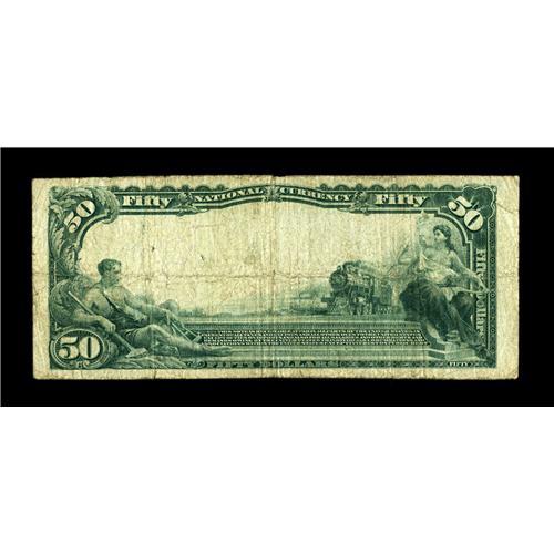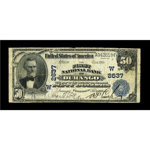 <B>Durango, CO</B></I> - $50 1902 Plain Back Fr. 684 <B>The First NB</B></I> Ch. # (W)2637<BR>The census currently stands at three $50 1902 PBs for this bank, not counting this example. However, two of those three listed are in much lower grades. This <B>Fine</B></I> example has nice pen signatures of the assistant cashier and vice president.<BR><BR><b>Shipping:</b> Coin/Currency (<a target="_blank" href="http://www.heritageauctions.com/common/shipping.php">view shipping information</a>)