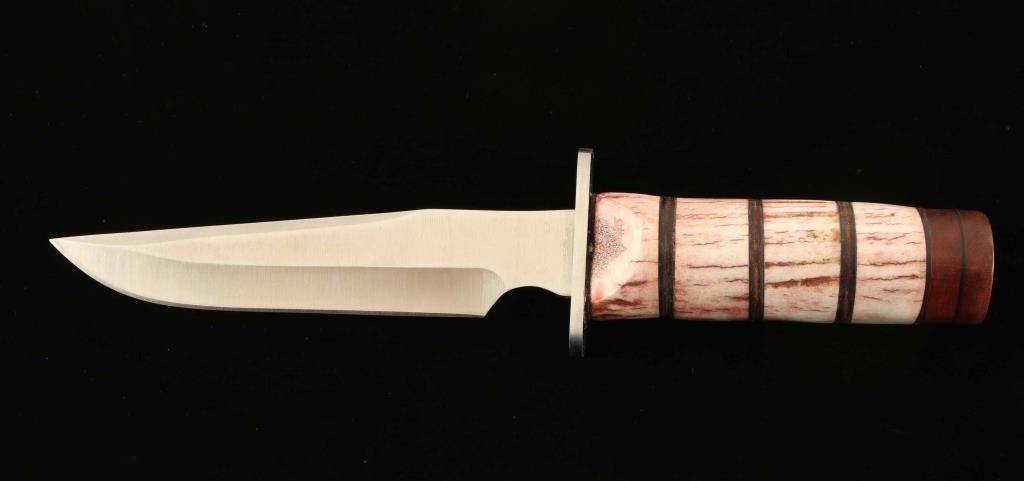 Bowie knife with full tang threaded. Custom made by well known Albuquerque area craftsman Marc Vallo. Knife has approx. 7 1/2" l stainless steel blade, overall 13". The handle is made with Rocky Mountain elk antler and leather which is all bound together with a threaded end cap made of paduak hardwood. Marked/signed by the artist as V-#15.