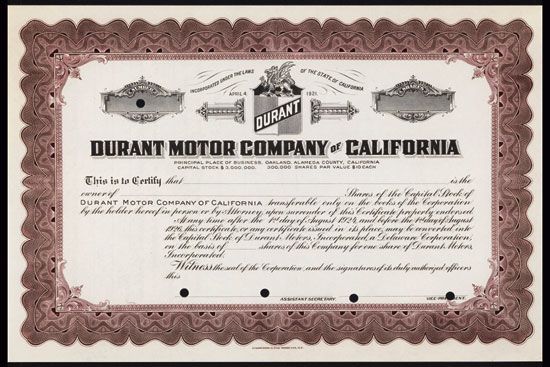 California, 1921, Odd Shares, Specimen Stock, Brown border with Company logo vignette, POC's, HBNC., XF to Uncirculated condition, XF condition. Rare and early automobile variety that is possibly unique.