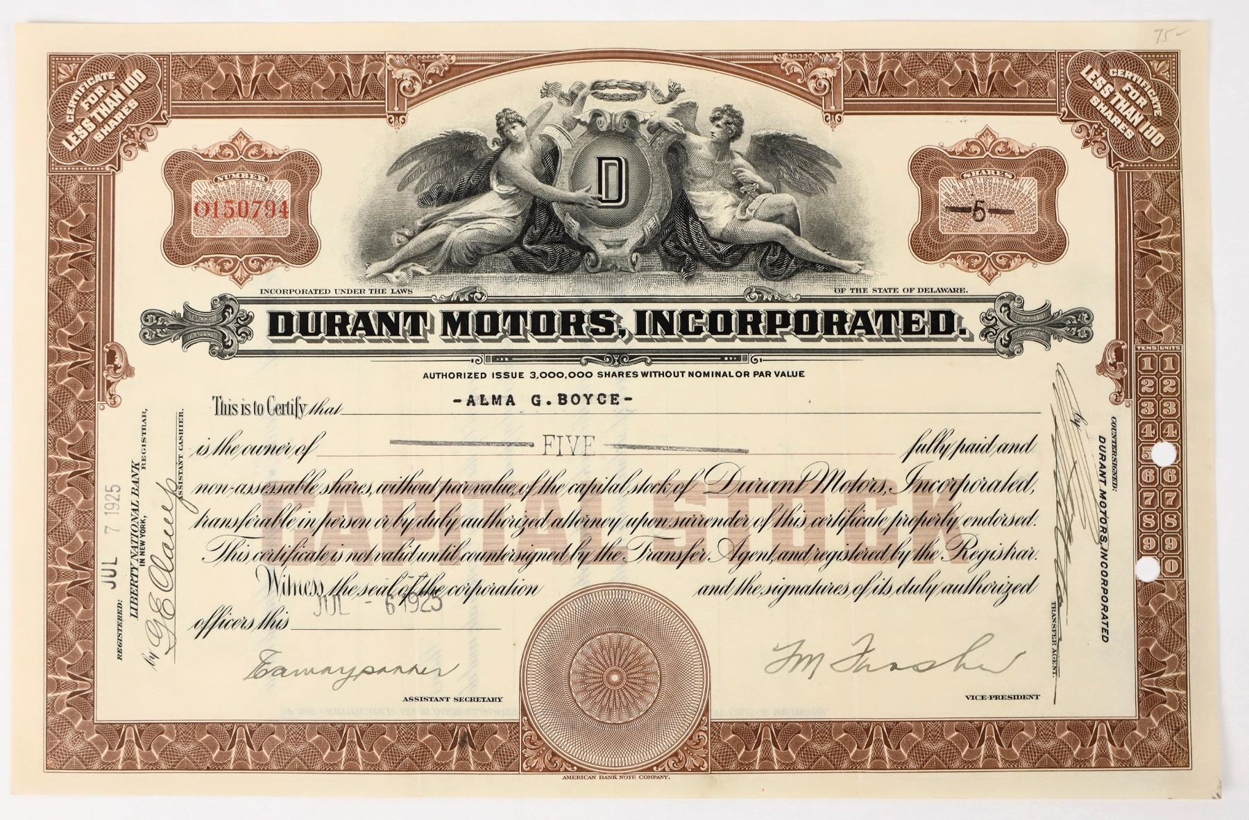 Issued in 1925, not cancelled. Established in 1921 by former General Motors CEO William "Billy" Durant. Operated until 1931 in Lansing, MI.
