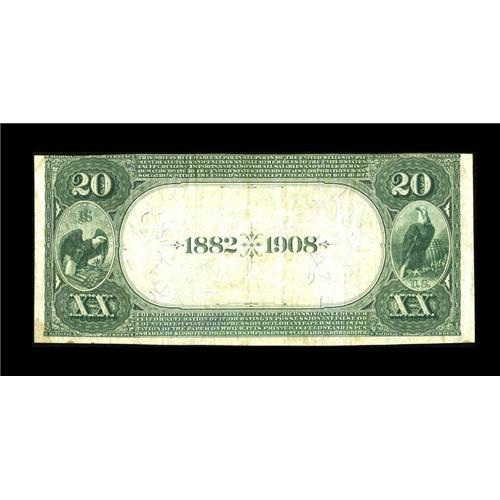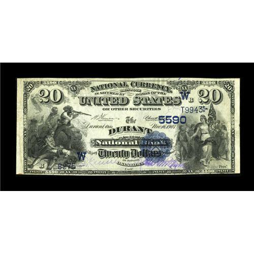 <B>Durant, OK</B></I> - $20 1882 Date Back Fr. 556 <B>The Durant NB</B></I> Ch. # (W)5590<BR>Large notes only from this bank, with this attractive $20 Date Back one of the nicer examples we've seen from here. <B>Very Fine,</B></I> with purple signatures.<BR><BR><b>Shipping:</b> Coins & Currency (<a target="_blank" href="http://www.heritageauctions.com/common/shipping.php">view shipping information</a>)