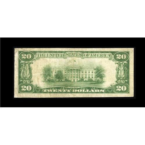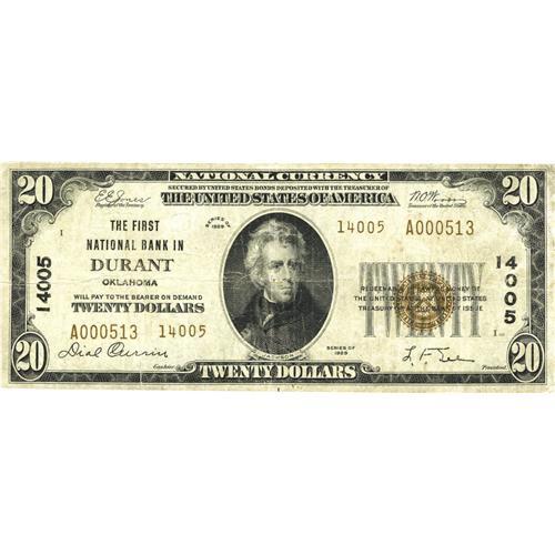 <B>Durant, OK</B></I> - $20 1929 Ty. 2 <B>The First NB</B></I> Ch. # 14005<BR>This is an extremely scarce 14000 charter bank with just five notes comprising the entire census from here. More important for collectors seeking to obtain such an example, our records show just one offering of any kind from here at public sale, with that coming over ten years ago in one of our 1996 sales. <B>Fine++,</B></I> with a small split at the bottom affecting little.
