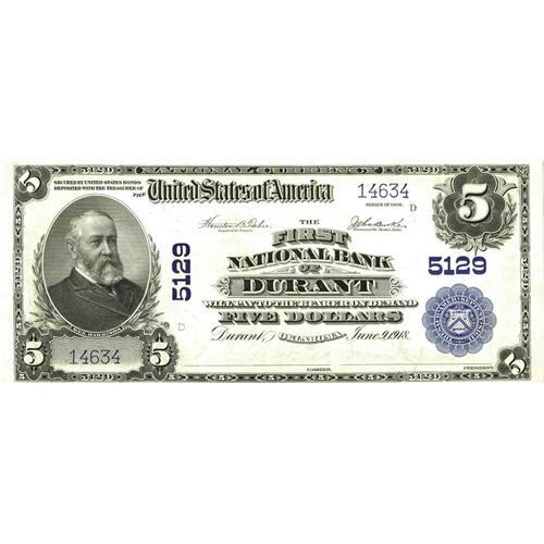 <B>Durant, OK</B></I> - $5 1902 Plain Back Fr. 606 <B>The First NB</B></I> Ch. # 5129<BR>While not a rare bank, few large examples from here are ever available in this state of preservation. Bright <B>Extremely Fine.</B></I>