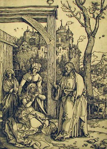 Durer, Albrecht (German, 1471-1528). Christ Taking Leave of His Mother, from the Life of the Virgin (B.92, M., Holl. 204, S.M.S. 182). Woodcut. 11.6 x 8.25 inches (sheet size, trimmed). Signed with monogram in the plate, lower left; large oval watermark in laid paper.