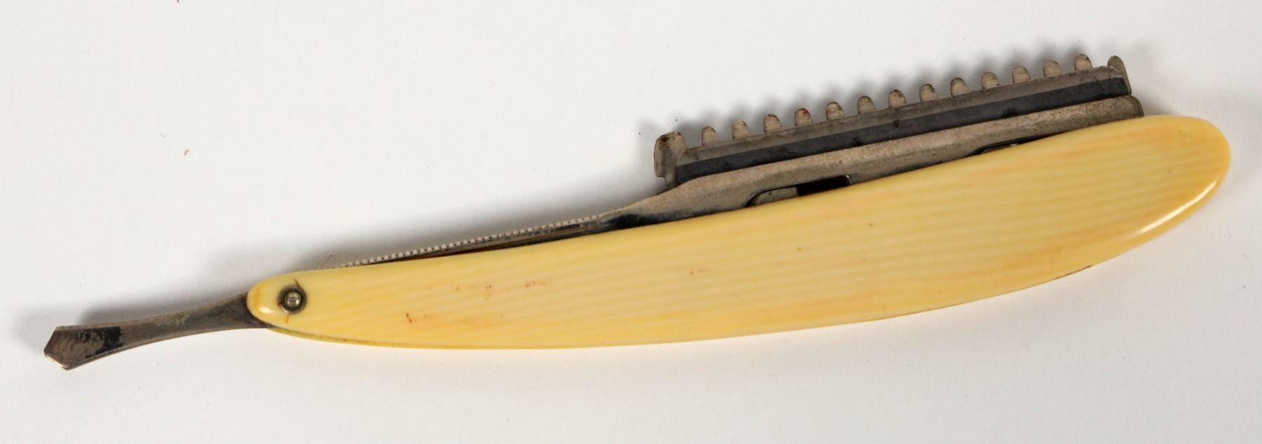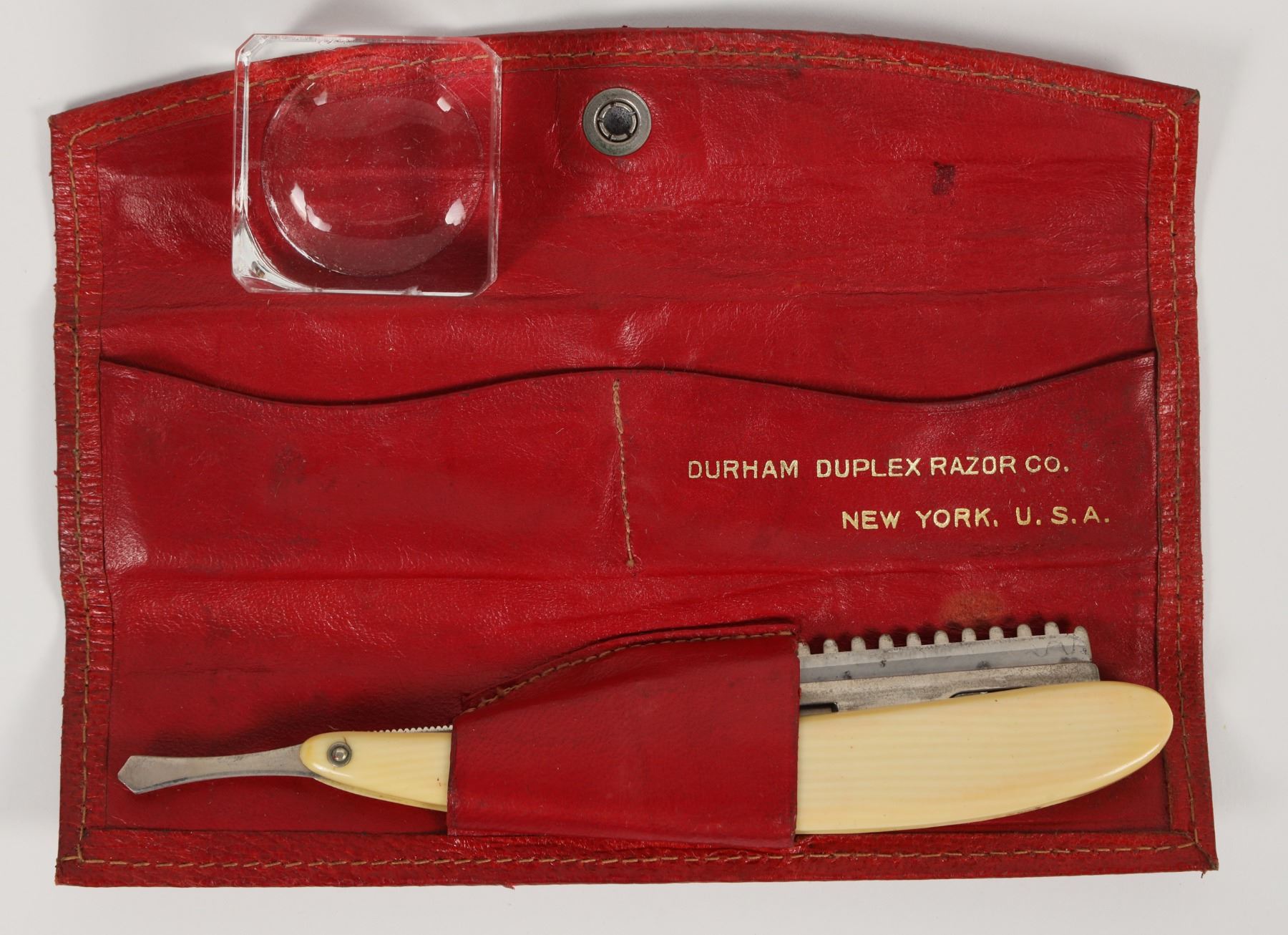 Vintage 1940's era Durham Duplex straight razor beard trimmer and carrying case. This is in excellent condition including the leather case and is considered rare.