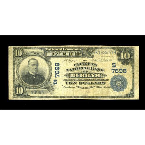 <B>Durham, NC</B></I> - $10 1902 Plain Back Fr. 624 <B>The Citizens NB </B></I> Ch. # (S)7698<BR>Merely eleven large are reported on this neighbor town to the capital city. <B>Very Good+.</B></I>