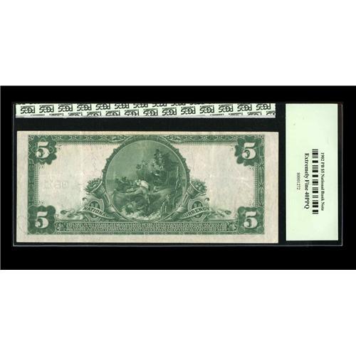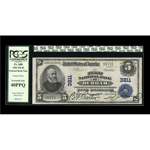 <B>Durham, NC</B></I> - $5 1902 Plain Back Fr. 600 <B>The First NB </B></I> Ch. # 3811<BR>This is an especially attractive <B>PCGS Extremely Fine 40PPQ</B></I> that is more than adequately margined and boasts vividly full strength black stamped officers' signatures. While clearly circulated, it offers all the aesthetic appeal one could hope for in a Third Charter Plain Back, regardless of technical grade.