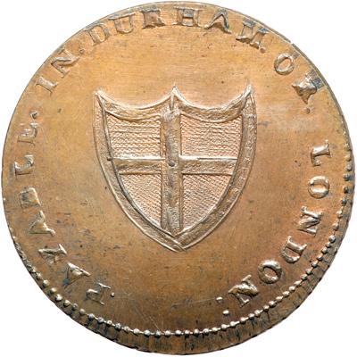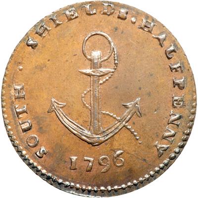 Durham. South Shields. Halfpenny, 1796. D&H-8. Edge: Engrailed. Shield of arms. Reverse: An anchor and cable. NGC graded MS-65 Brown.