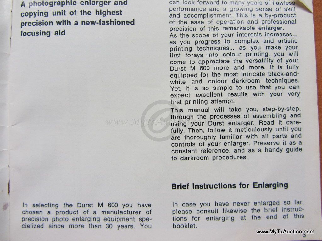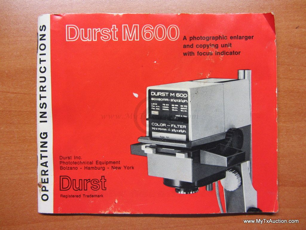 Durst M600 photographic enlarger and coping unit. Made by Durst Inc. The machine is packed in its original Styrofoam packing appears to be complete. The value of the Durst M600 is $50.00-$120.00. EXTRAS: two lens 1 is a Isco-Gottingen Iscorit 1:4.5/50mm valued $25.00-$50.00 the 2nd is a Isco-Gottingen Iscorit 1:4.5/75mm. Plus 2 lens boards, 1 is a Sixpla 17335 valued at $10.00-$20.00 and the 2nd is Sixtub valued at $22.00-$49.00 Free download & print the operating instructions from www.jollinger.com