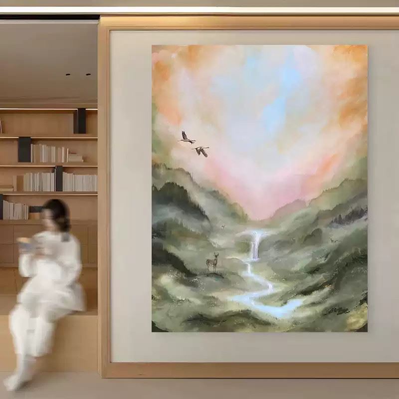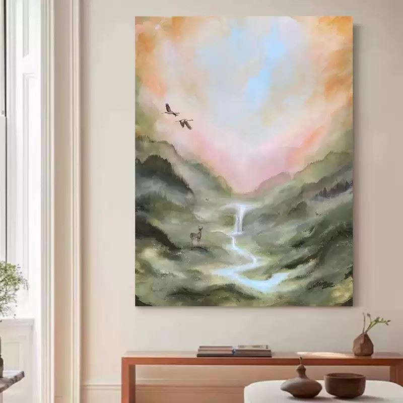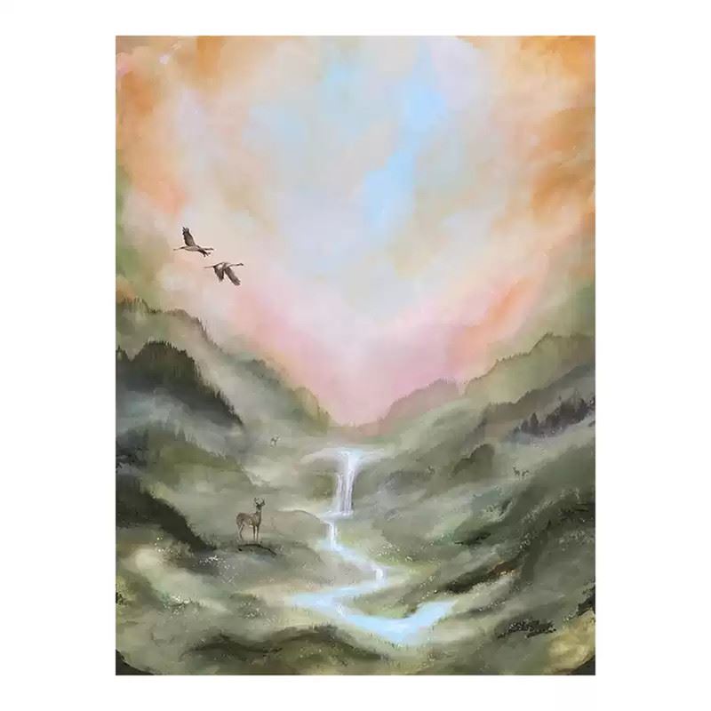 In the serene valley, the evening glow casts warmth on the winding stream, with its gentle flow mirroring the soft light. A few deer leisurely roam the distant meadow, while birds soar above, creating a peaceful and tranquil natural scene. Dimensions: 24 x 31 inches.
