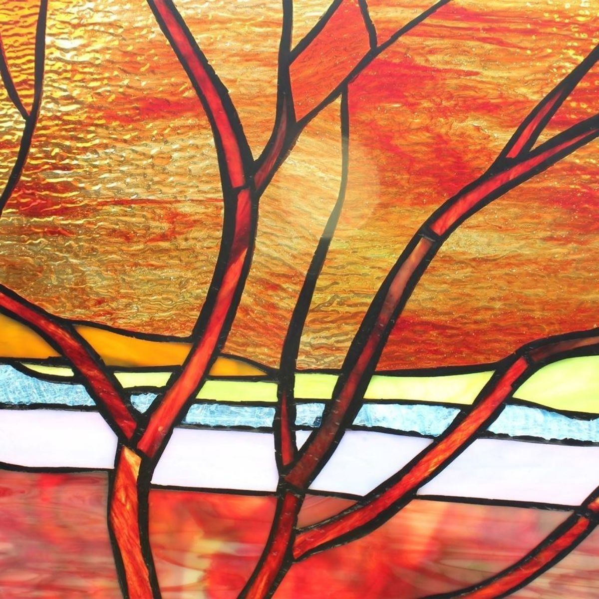 Dusk Landscape stained glass hanging panel. Created with 137 pieces of stained art glass, wrapped in copper foil. 24" H X 17 1/2" W. comes with hanging chain.