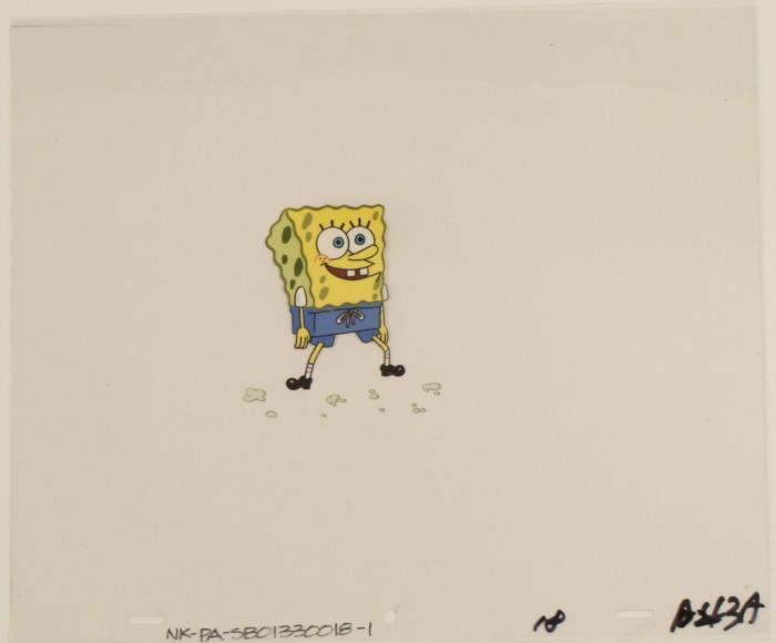 To create production cels, the original animator's drawing is transferred onto an acetate cel (by hand-inking and/or photo copying). The cel is then hand-painted on the reverse side. The cel is ready to be matted and framed. The animator's notations are at the bottom of the cel. The cel has multiple layers; first is the dust and the second cel is SpongeBob.