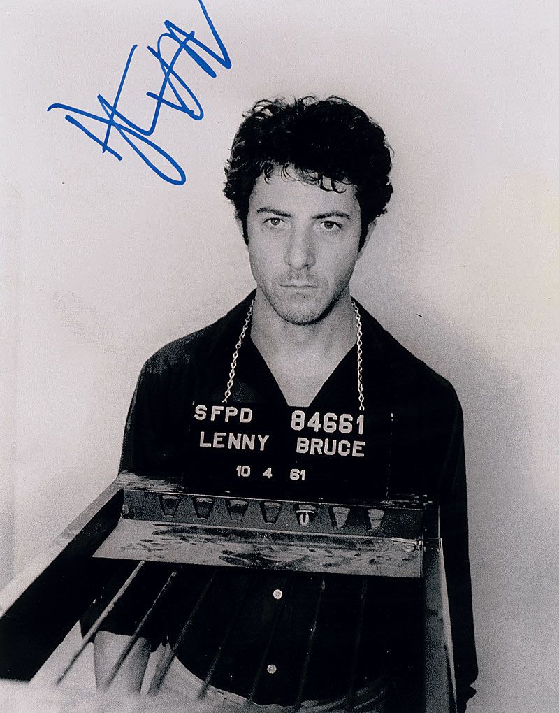Satin-finish 11 x 14 photo of Hoffman as Lenny Bruce having his mug shot taken, signed in blue felt tip. In fine condition.