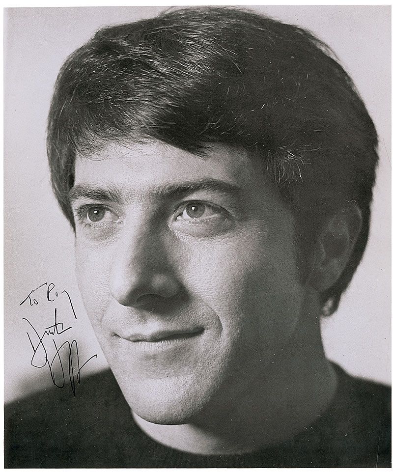 Vintage glossy 7.5 x 9 head-and-shoulders photo, signed and inscribed in black ink, “To Roy, Dustin Hoffman.” In fine condition, with slightly trimmed edges.