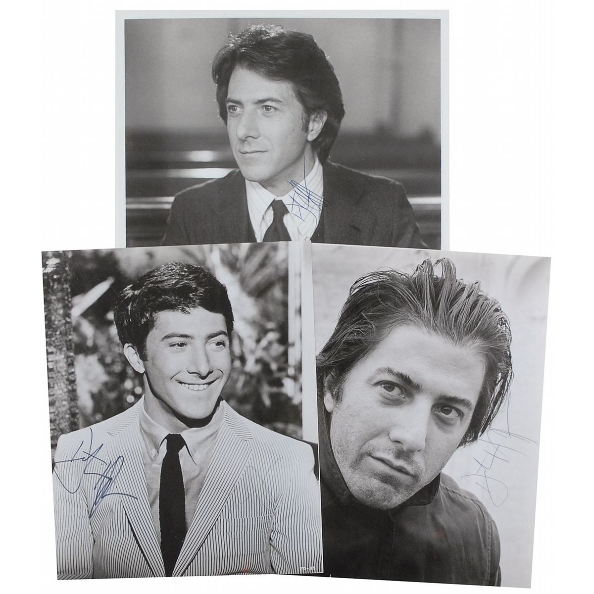 Three glossy photos of Hoffman in his Academy Award-nominated roles (The Graduate, Midnight Cowboy, and Kramer vs. Kramer), each signed in black ink or felt tip. In overall fine condition.