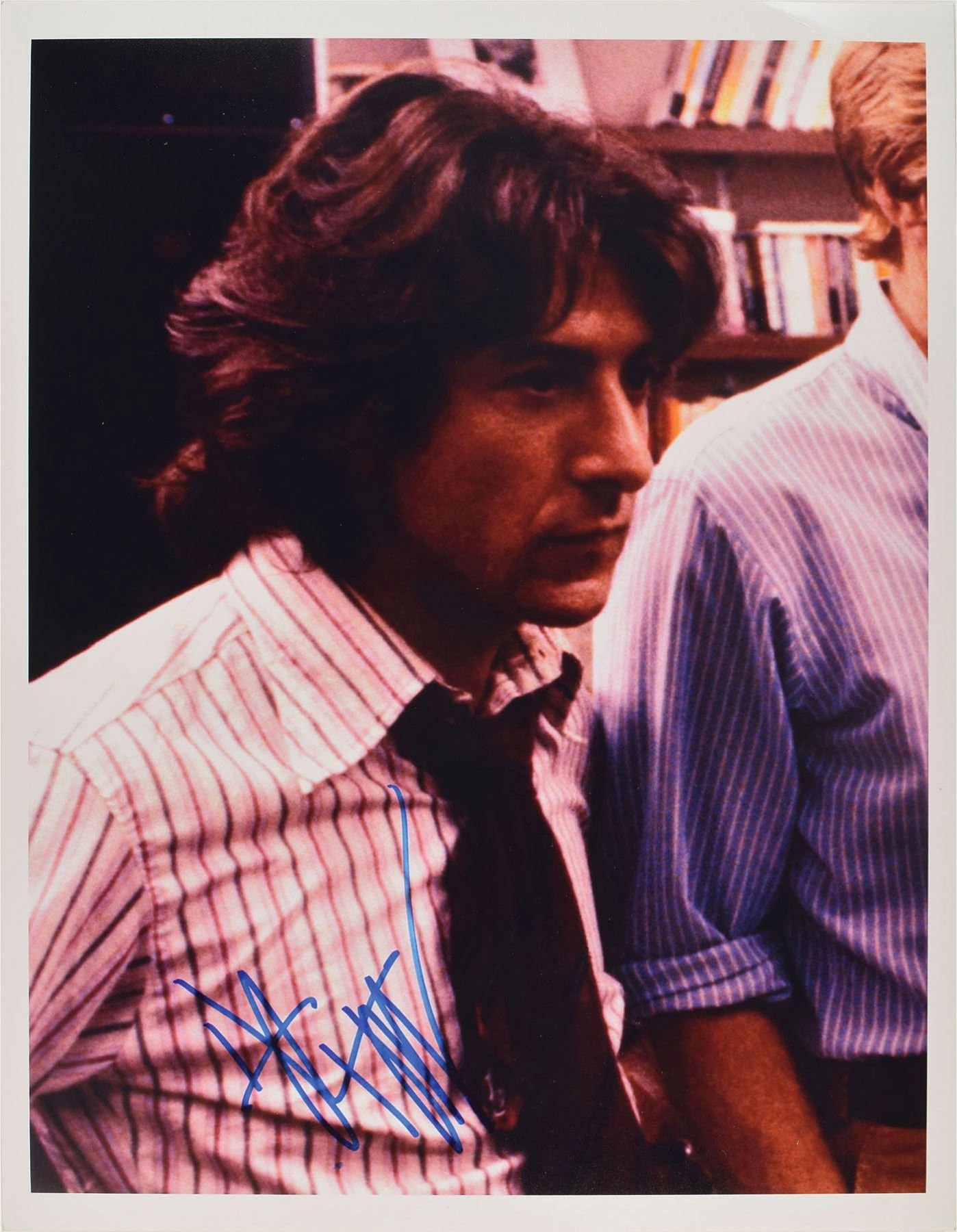 Color satin-finish 12 x 15 photo of Hoffman as Carl Bernstein from the 1976 film All the President's Men, signed in blue felt tip. In fine condition.