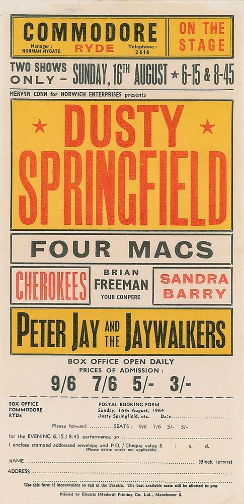 Two items: an ALS signed “Dusty,” one page, 5.5 x 7, no date, addressed to a fan, in full: “Thank you so much for the little dog—he is very sweet. It was very kind of you to think of sending me something.” The second item is an original color 5.5 x 11.25 handbill for two Dusty Springfield shows at the Commodore in Ryde on August 16, 1964, which lists the supporting acts as Four Macs, the Cherokees, Sandra Barry, and Peter Jay and the Jaywalkers. In overall fine condition, with some light creasing. Accompanied by a certificate of authenticity from Tracks.
