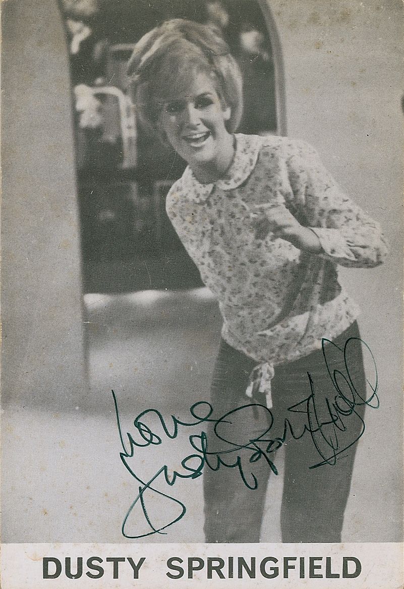 Vintage 3.75 x 5.5 promotional card photo, signed in black felt tip, “Love, Dusty Springfield.” In very good condition, with scattered foxing and a couple of light surface creases.