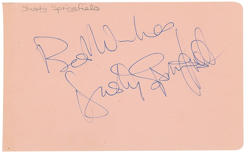 Vintage ballpoint signature, “Best wishes, Dusty Springfield,” on a beige 6 x 3.75 album page with a collector’s notation along top edge. In fine condition. Accompanied by a certificate of authenticity from Tracks.