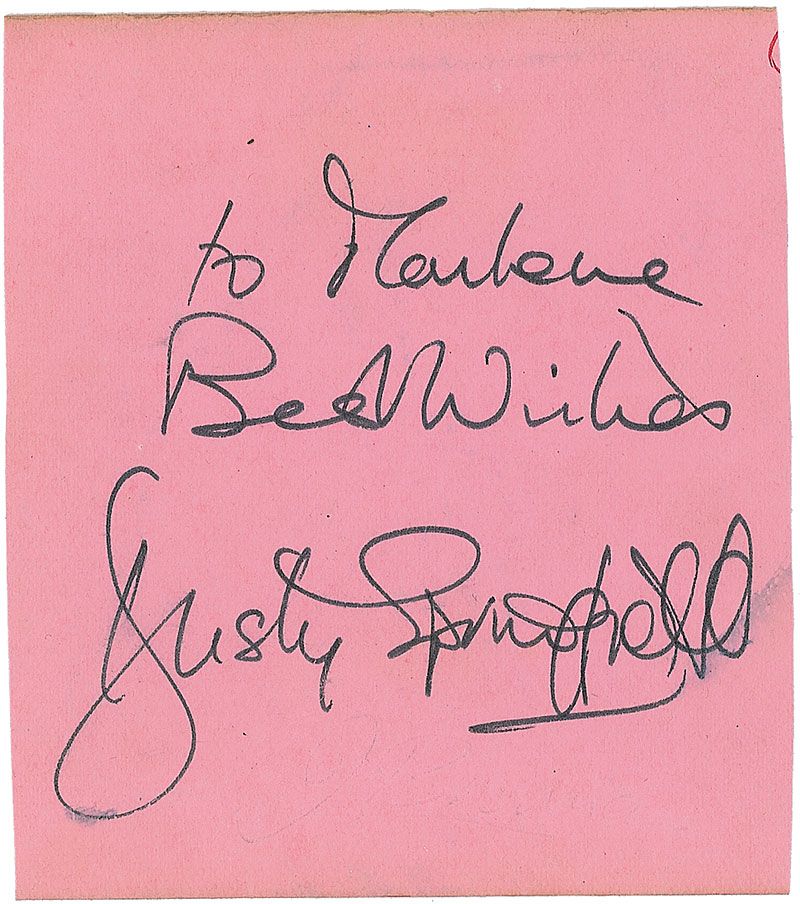 Vintage felt tip signature and inscription, “To Marlene, Best wishes, Dusty Springfield,” on an off-white 3.25 x 3.75 album page. In fine condition, with a slight brush to end of signature and slightly trimmed vertical edges. Accompanied by a certificate of authenticity from Tracks.
