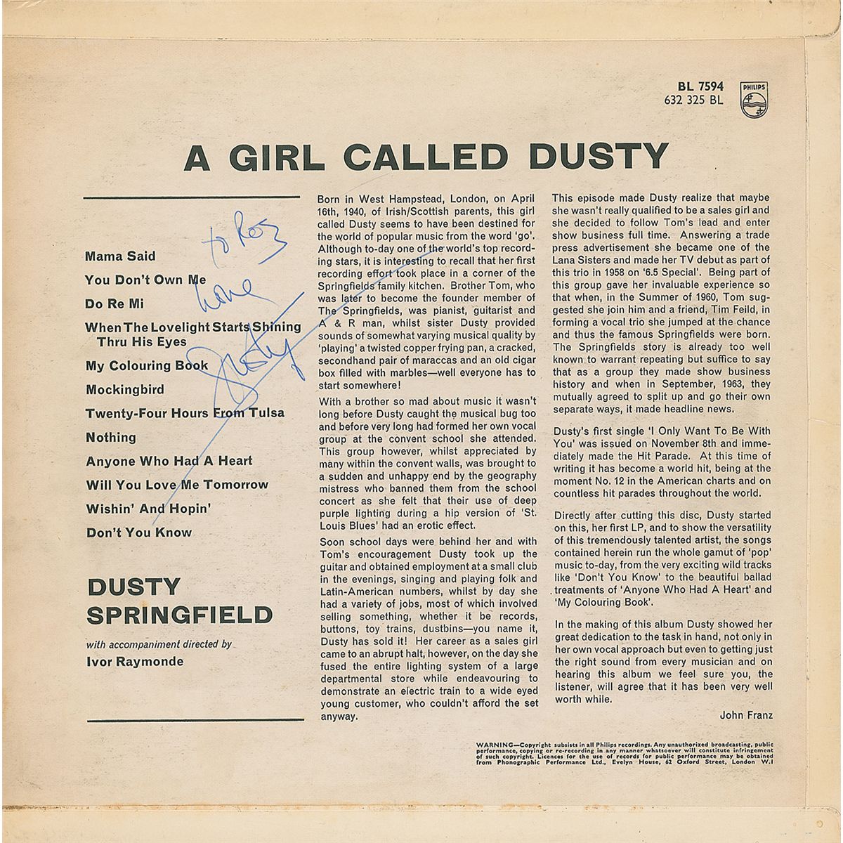 A Girl Called Dusty album signed and inscribed on the back cover in blue ballpoint. In fine condition, with some light rippling to front cover. The record is included.