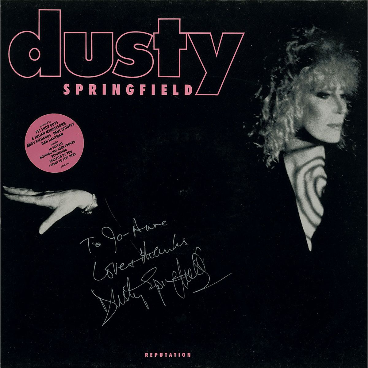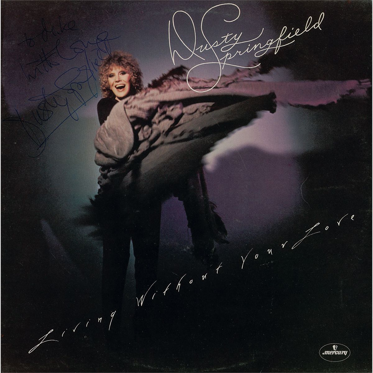 Two albums: a Living Without Your Love album, signed and inscribed on the front cover in blue ballpoint, “To Mike, with love, Dusty Springfield”; and a Reputation album, signed and inscribed on the front cover in silver ink, “To Jo-Anne, Love & thanks, Dusty Springfield.” In overall fine condition, with light contrast to signature on the Living Without Your Love album. The records are included. Consignor notes that these originate from the collection of a BBC producer.