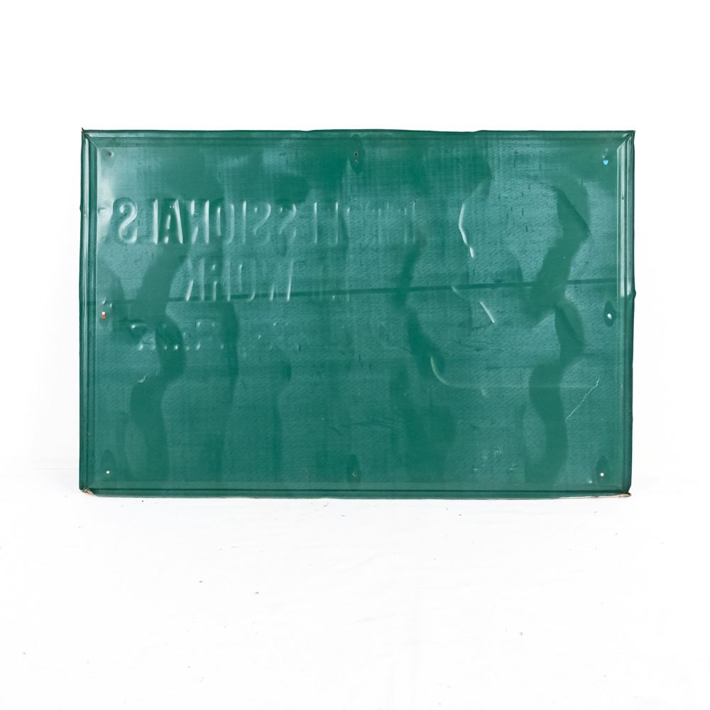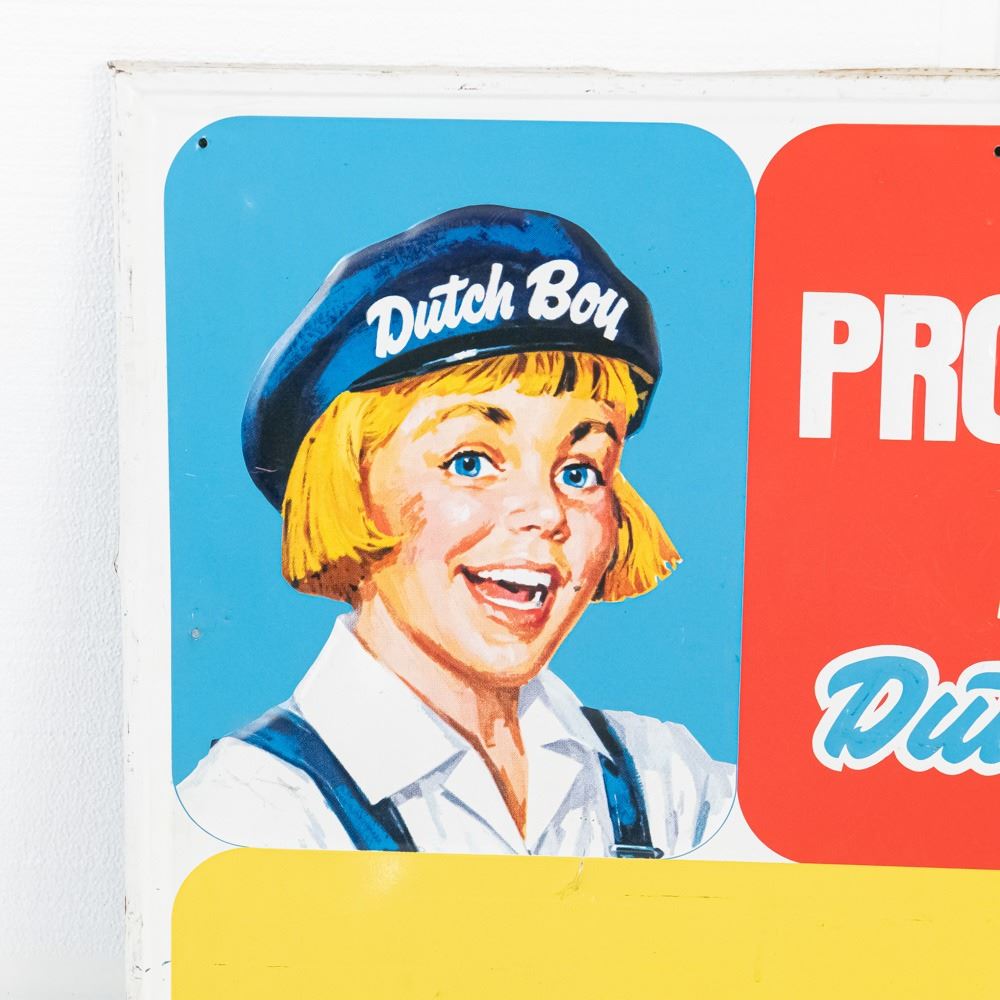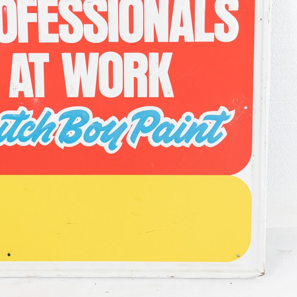 Vintage "Dutch Boy Paint" Professionals at Work embossed single sided tin advertising sign. Very good to good overall condition with some discoloration, soft corners, stray marks and oxidation. Approximately 23"t x 34.5"l. Perfect addition to your collection, please use photos to judge condition and bid accordingly.