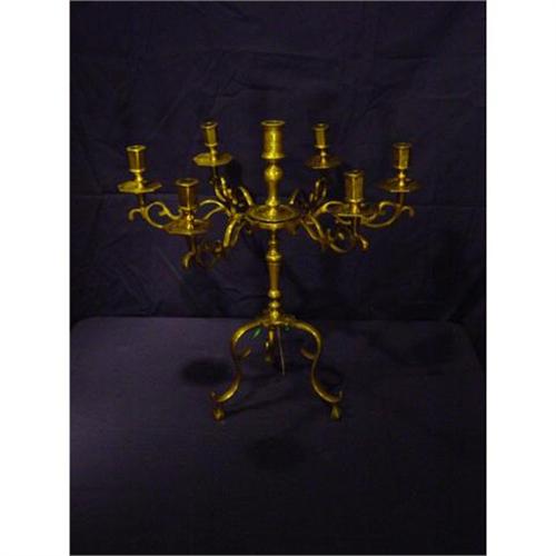 Lovely mid-seventeenth century (Dutch or English) seven light brass table candelabrum with original undisturbed patina. Detachable candle sockets and tripod base. Hand-turned threaded fittings.