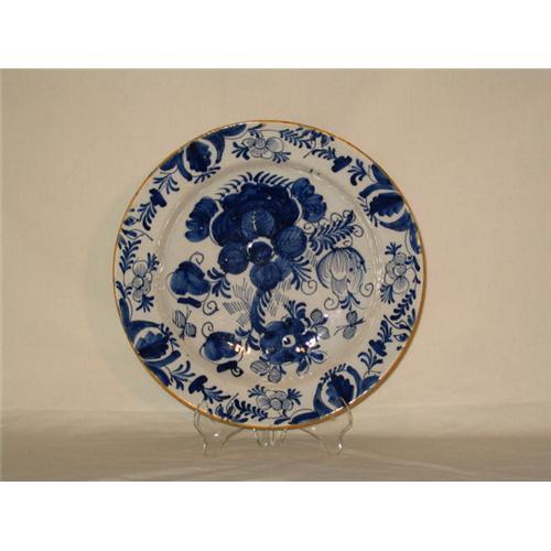 Dutch Delft Charger showing traditional floral pattern in blue and white with gold and yellow rim around the charger. Excellent condition overall. c. 1750
