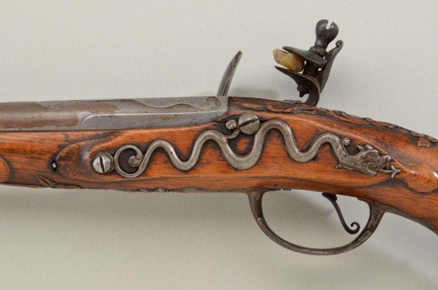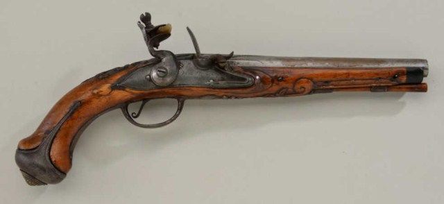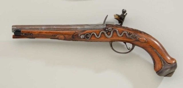 Dutch Flintlock pistol signed “Iean Hicnar a Leeuwarden” circa about 1725-1750 showing elaborate serpentine iron side plate. The pistol measures 13” overall with 7-1/8” barrel of approx 52 cal smooth bore. Themetal surfaces show a gray patina finish with some scattered light to moderate pitting and erosion. The stock is good with well defined carving, some minor losses and imperfections. The action is not working butgenerally good overall. Est.;$1,400-$2,800.