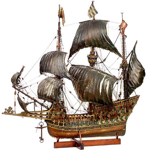 Dutch Frigate on Stand Model of a 16th century armed trading ship, complete with all sails and superstructure, length 35 in.<Br>
