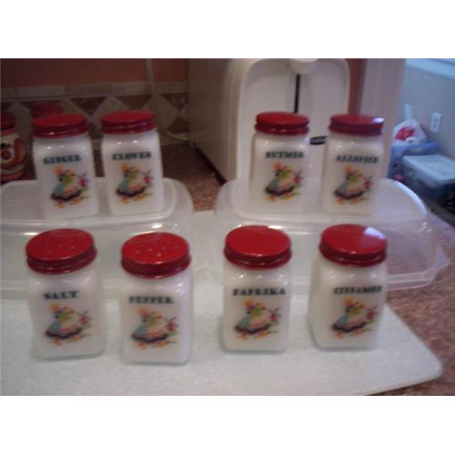 This is a set of eight spice jars. They are old jars and not reproductions. They are 3" tall and 1.75" square. The tops are original to the jars but have been repainted. They are plain on two sides and have a scroll design on two sides. These were probably made by Dove or Hazel Atlas originally but I don't really know for sure. The decals on front are new but made from a vintage decal. They have been sprayed with an acrylic spray to make them wipeable for cleaning. In this set you have a Salt, a Pepper, a Cloves, a Nutmeg, a Ginger, a Paprika, an Allspice, and a Cinnamon. The salt and pepper have holes in the top and the rest have metal shaker inserts. These are old so you would expect to find some metal wear on the inserts and the insides of the lids, but these are in good condition for their age. I didn't feel any chips are cracks. This set is really adorable and would look great in any vintage kitchen.