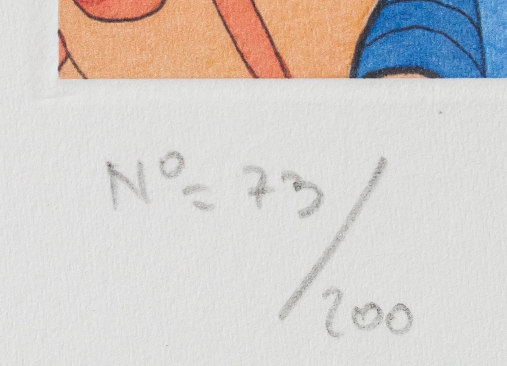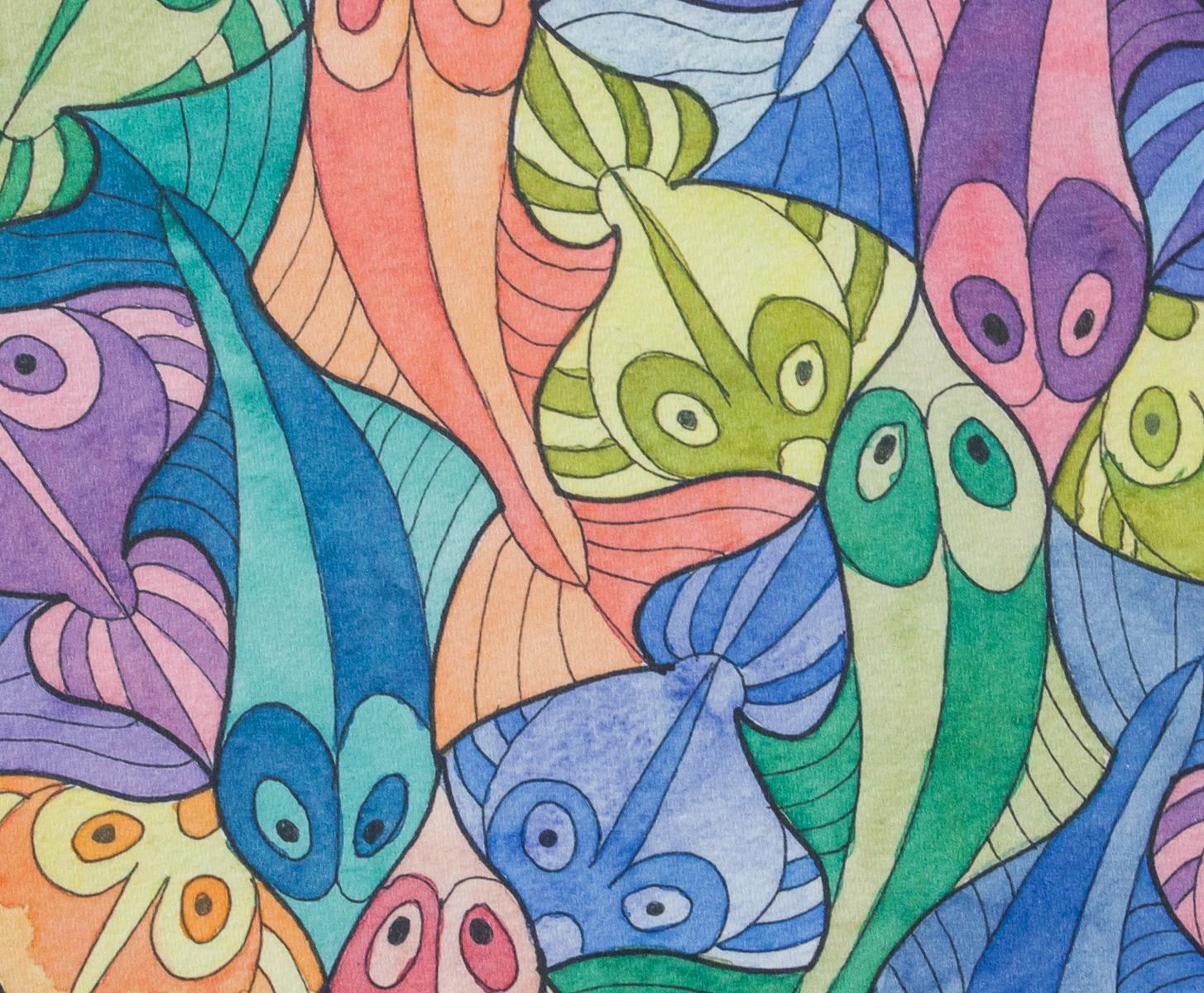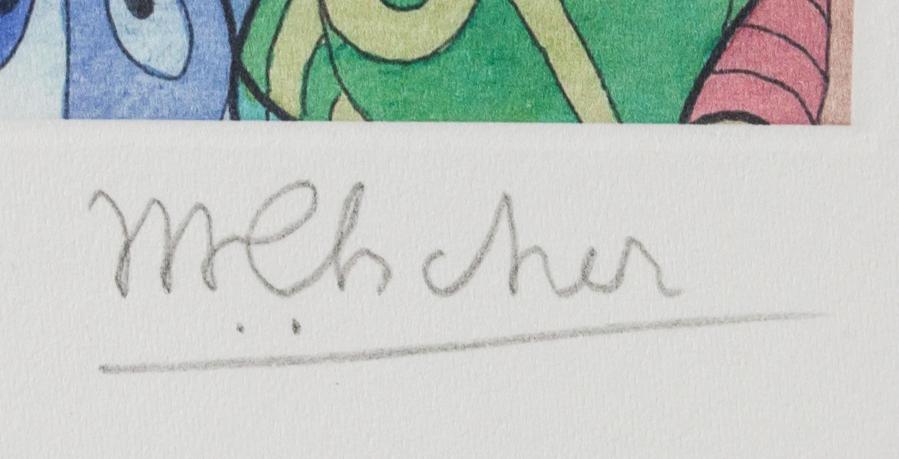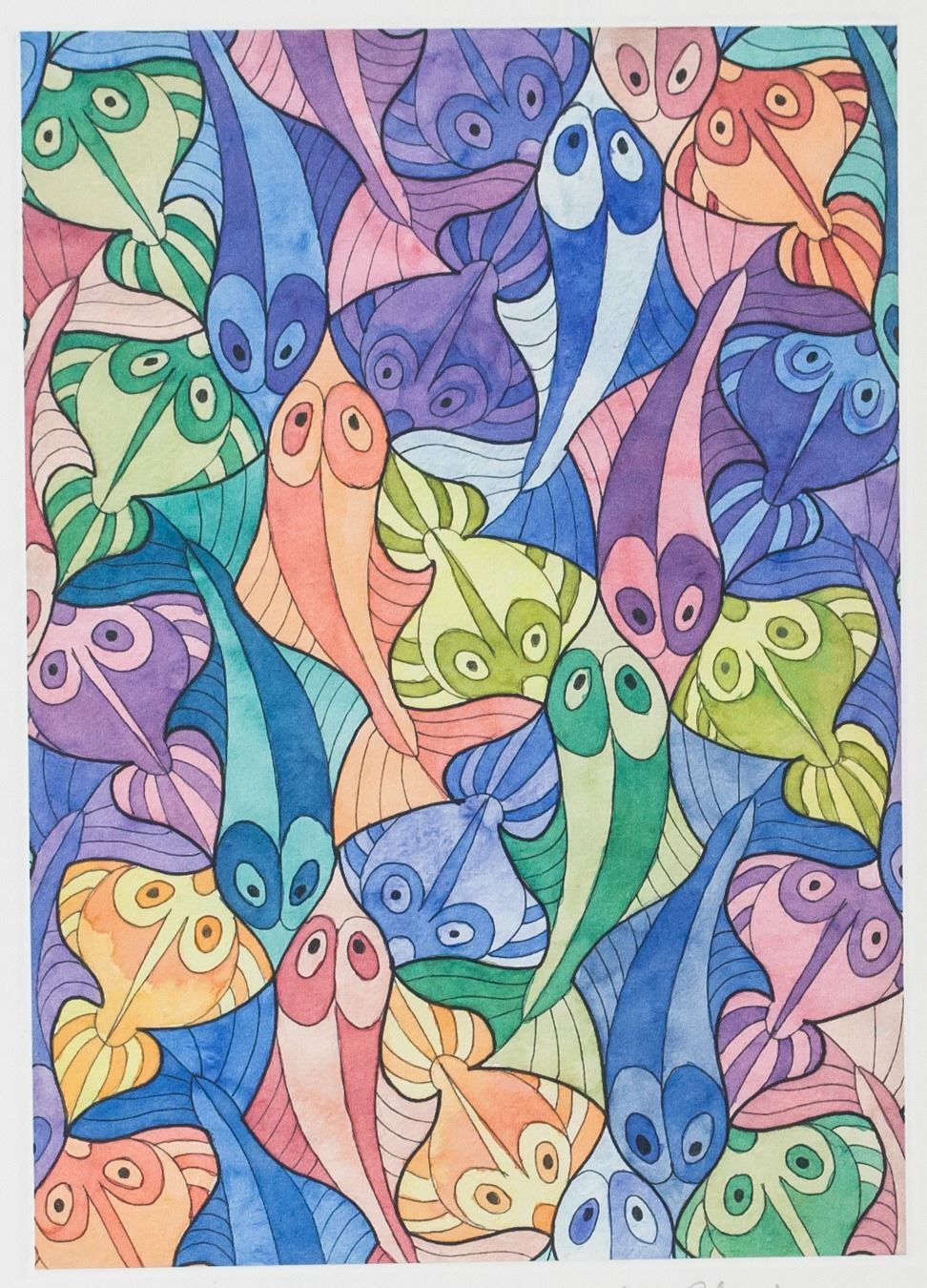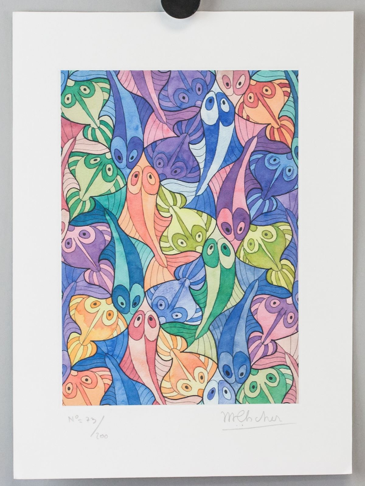 Lithograph on paper. Featuring repeating pattern of fish. Numbered "73/200" to the bottom left. Signed "MC Escher" to the bottom right. Image size: 21 x 15 cm (8.25 x 5.75 inches). Sheet size: 29 x 21 cm (11.5 x 8.5 inches). Provenance: This lot carries limited provenance from a Southern Ontario estate