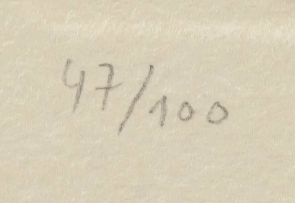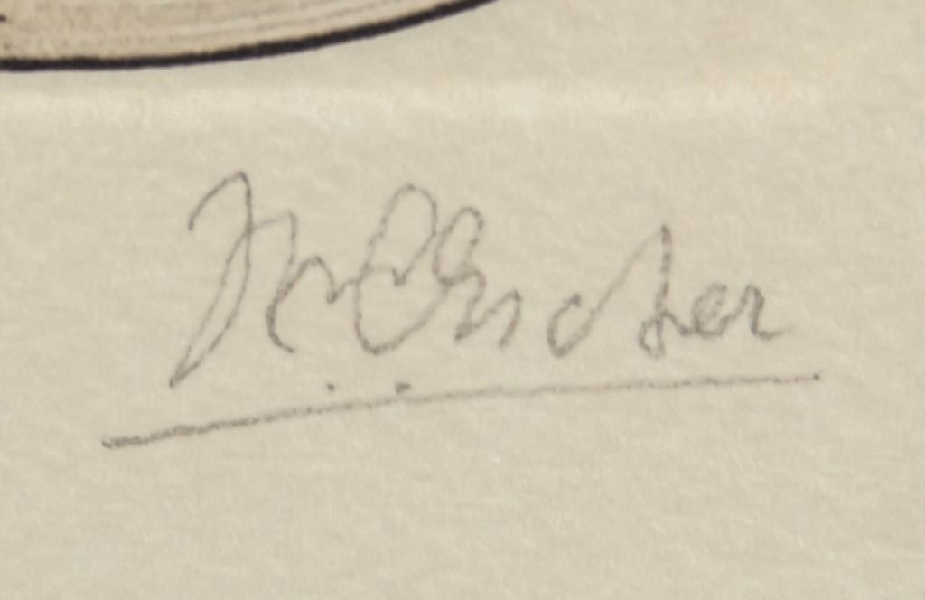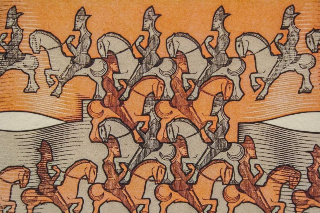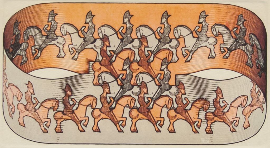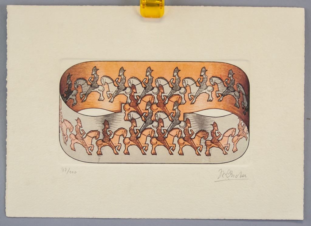 Lithograph on paper. Featuring repeated motif of a man on a horse. Signed "MC Escher" to the bottom right. "47/100" inscribed to the bottom left. Print: 10 x 19 cm (4 x 7.5 inches). Mat: 21 x 30 cm (8.25 x 12 inches).